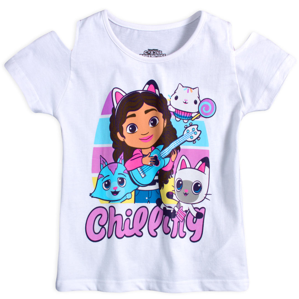 Dievčenské tričko s krátkym rukávom, s prestrihmi na ramenách. Farebný obrázok Gábinky z obľúbeného animovaného seriálu.