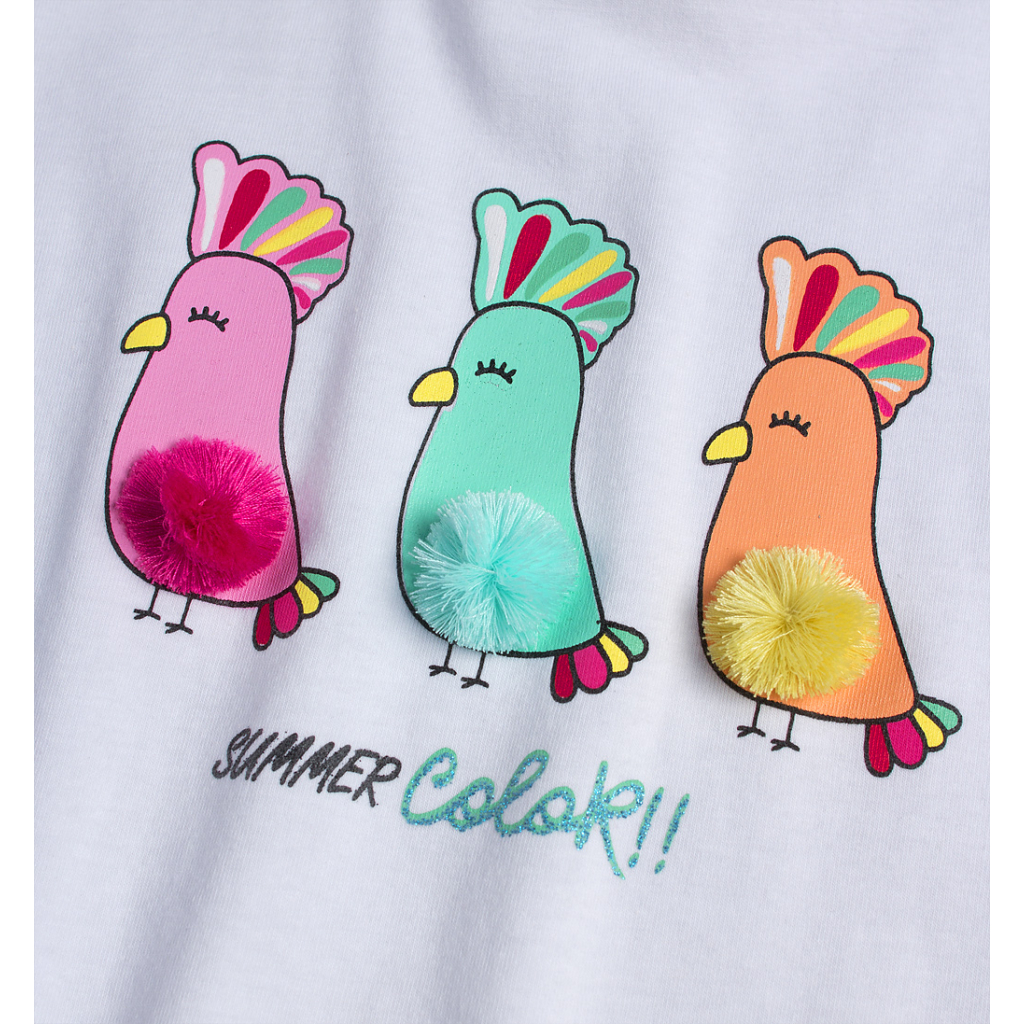 Krásne letné tričko s papagájmi pre dievčatká. Farebná potlač papagájov s našitými brmbolcami a trblietavý nápis. Vyhrnuté, krátke rukávy, jemný lem pri krku. Príjemný bavlnený úplet.Dodatočné parametre