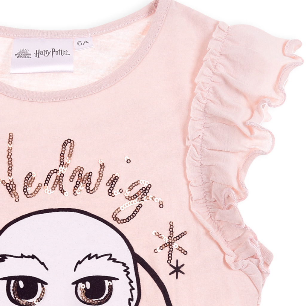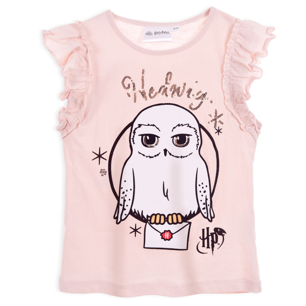 Dievčenské tričko so sovou Hedvigou z Harryho Pottera. Bez klasického rukávu, s našitým volánom. Príjemný, pružný materiál.Dodatočné parametre