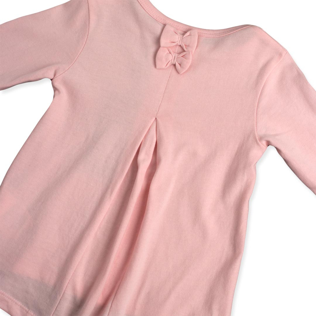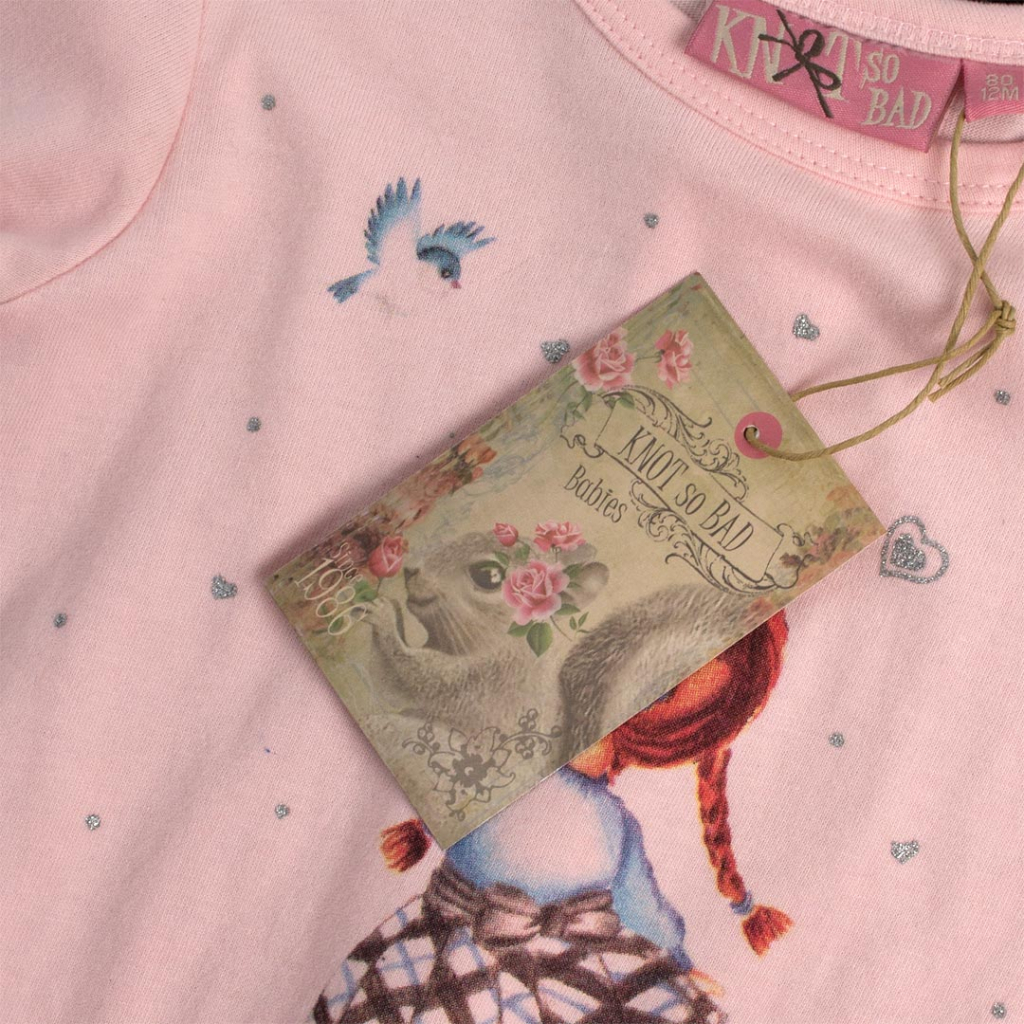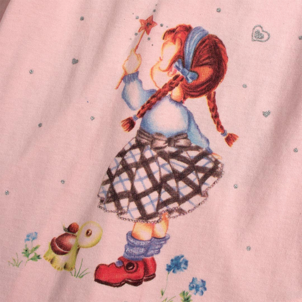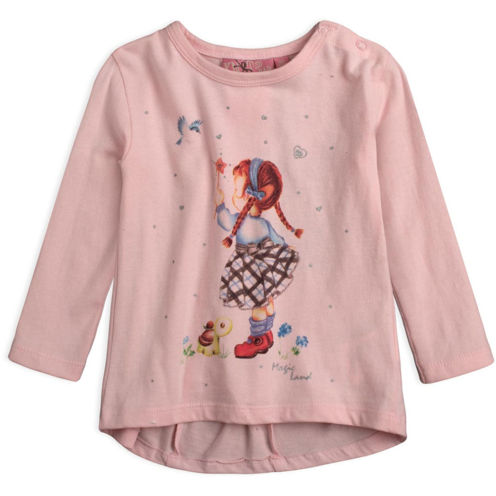Dievčenské tričko s dlhým rukávom. Vpredu potlač. Na ramene zapínanie na patentky. Vzadu našité mašličky a vsadka efektne rozširujúca strih. Zadný diel predĺžený. Mäkký a príjemný úplet, elastické.Dodatočné parametre