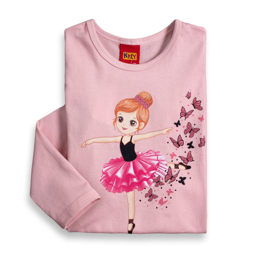 Dievčenské tričko s dlhým rukávom. Pohodlný, mierne rozšírený strih. Mäkký bavlnený úplet. Krásna potlač baletky. Vyrobené v Brazílii.Dodatočné parametre