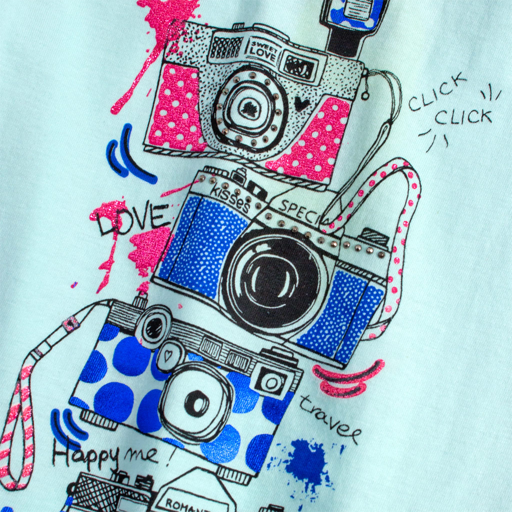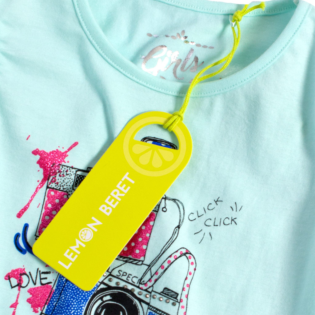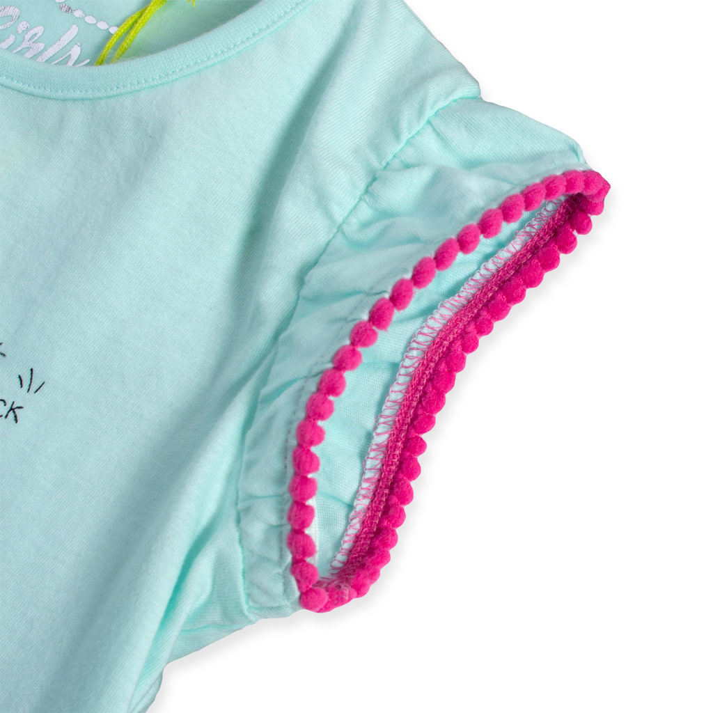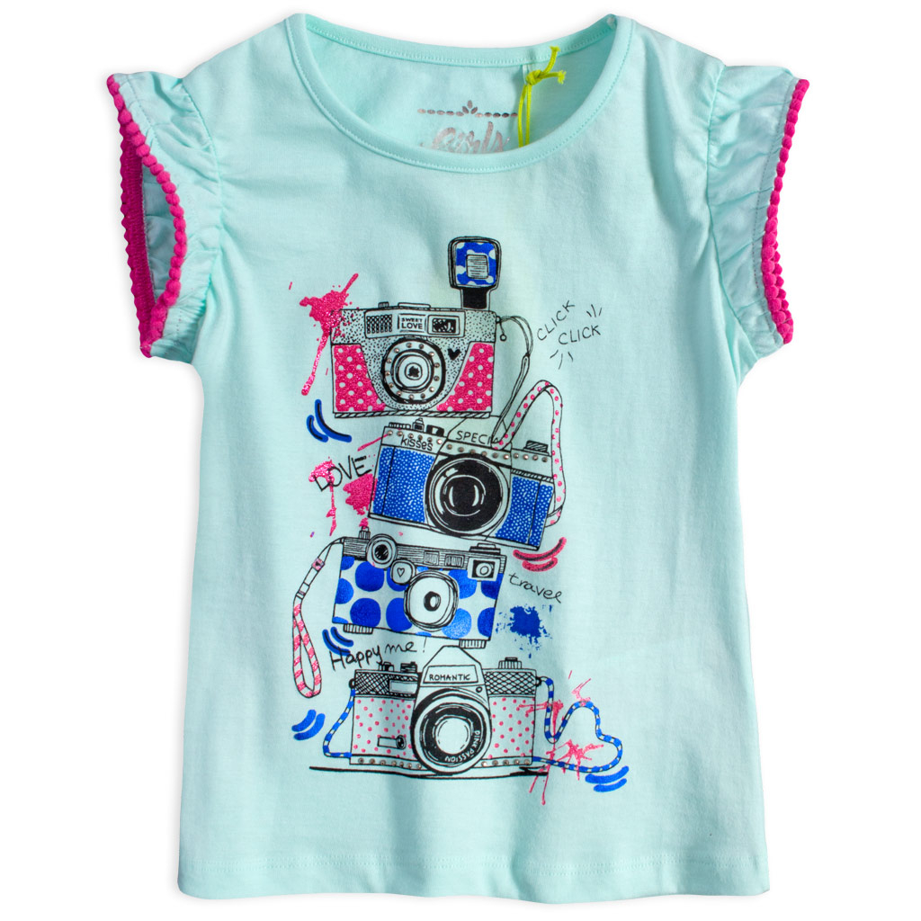 Dievčenské tričko s potlačou. Krátky volánikový rukáv s ozdobným okrajom. Mäkký a pružný úplet.Dodatočné parametre