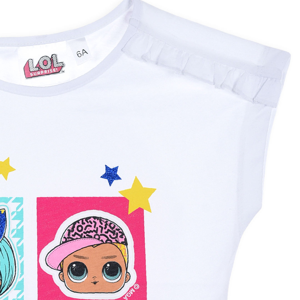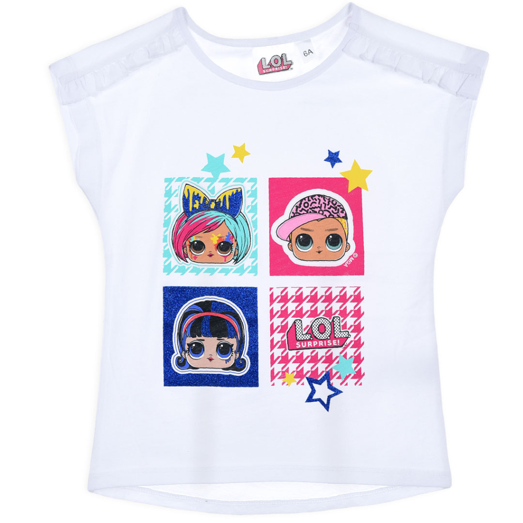 Dievčenské tričko s farebnou potlačou L.O.L SURPRISE. Krátky, spadnutý rukávik s volánikom. Pružný bavlnený úplet.Dodatočné parametre