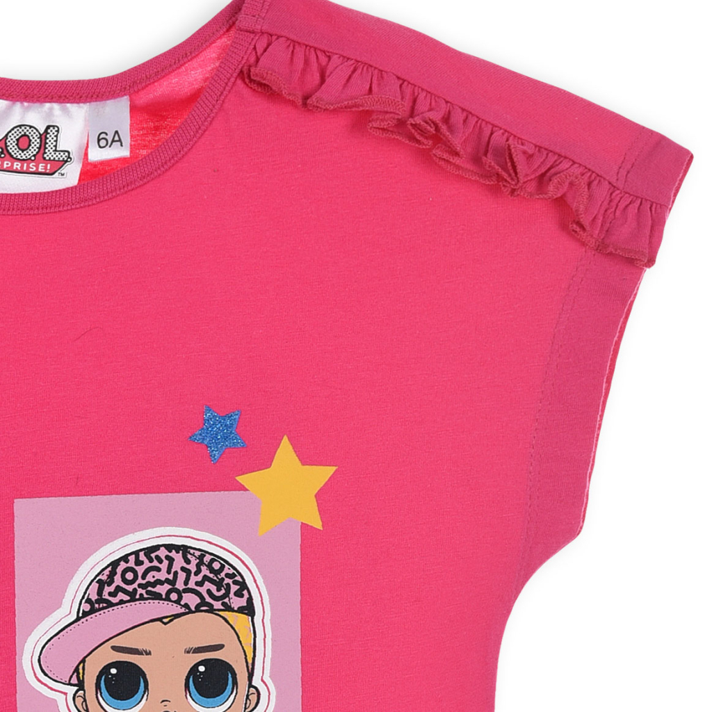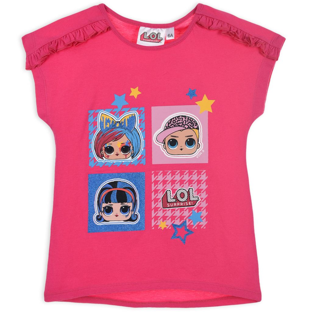Dievčenské tričko s farebnou potlačou L.O.L SURPRISE. Krátky, spadnutý rukávik s volánikom. Pružný bavlnený úplet.Dodatočné parametre