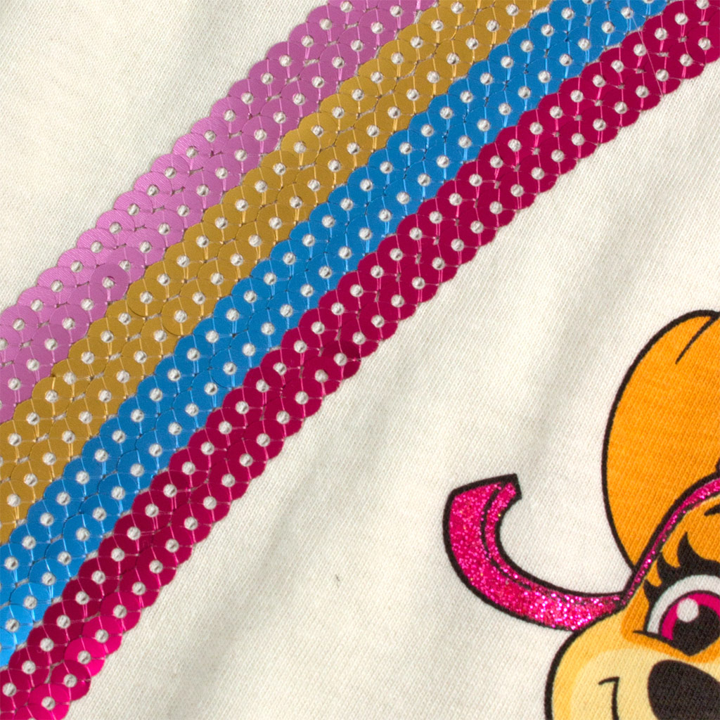 Krásne dievčenské tričko so Skye z Labkovej patroly. Trblietavá potlač a efektná dúha z našitých farebných flitrov. Kvalitný, bavlnený úplet.Dodatočné parametre