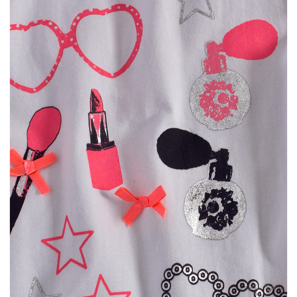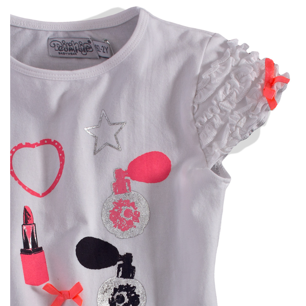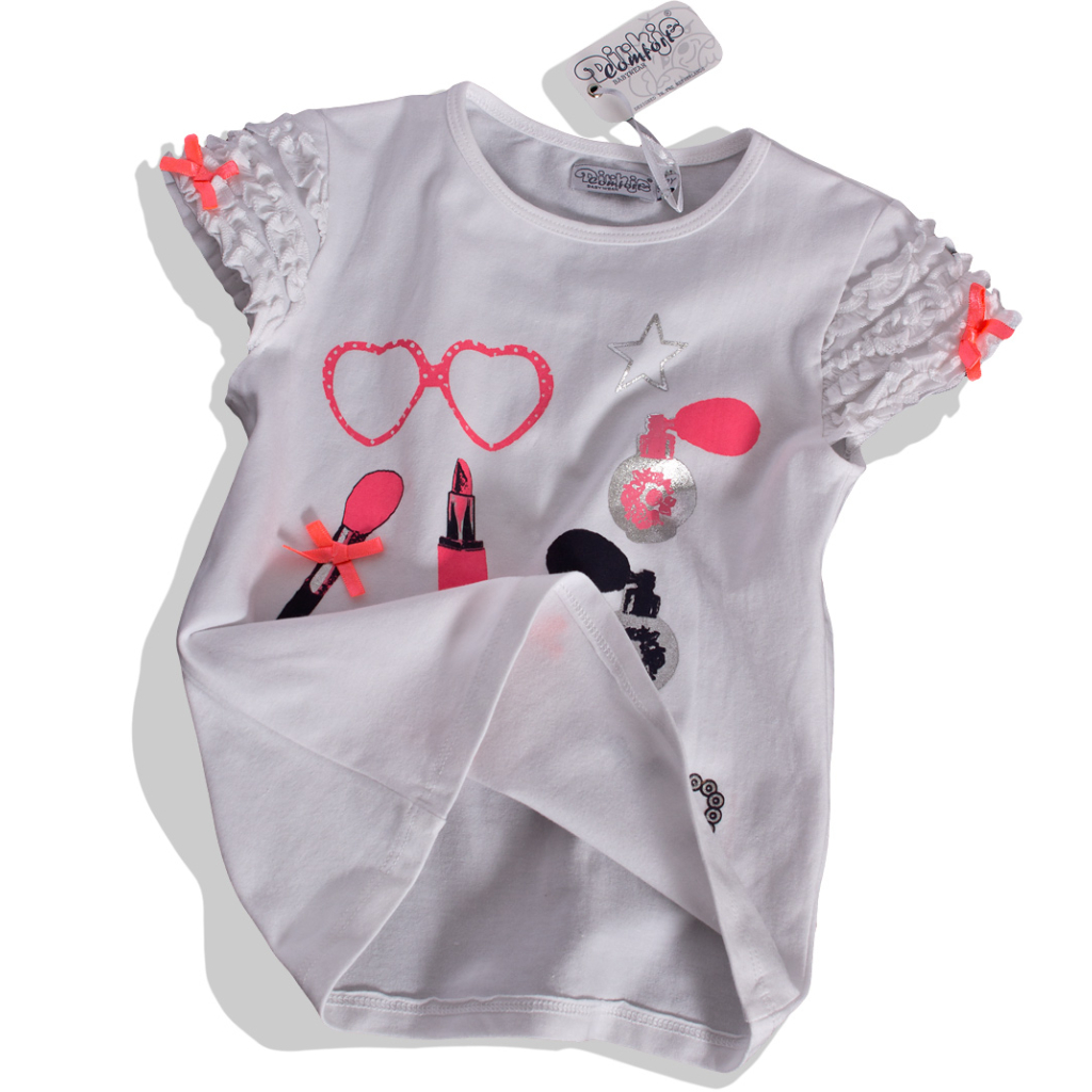 Dievčenské tričko. Krátke rukávy s našitými volánikmi. Potlač, našité mašličky. Príjemný bavlnený elastický úplet.Dodatočné parametre