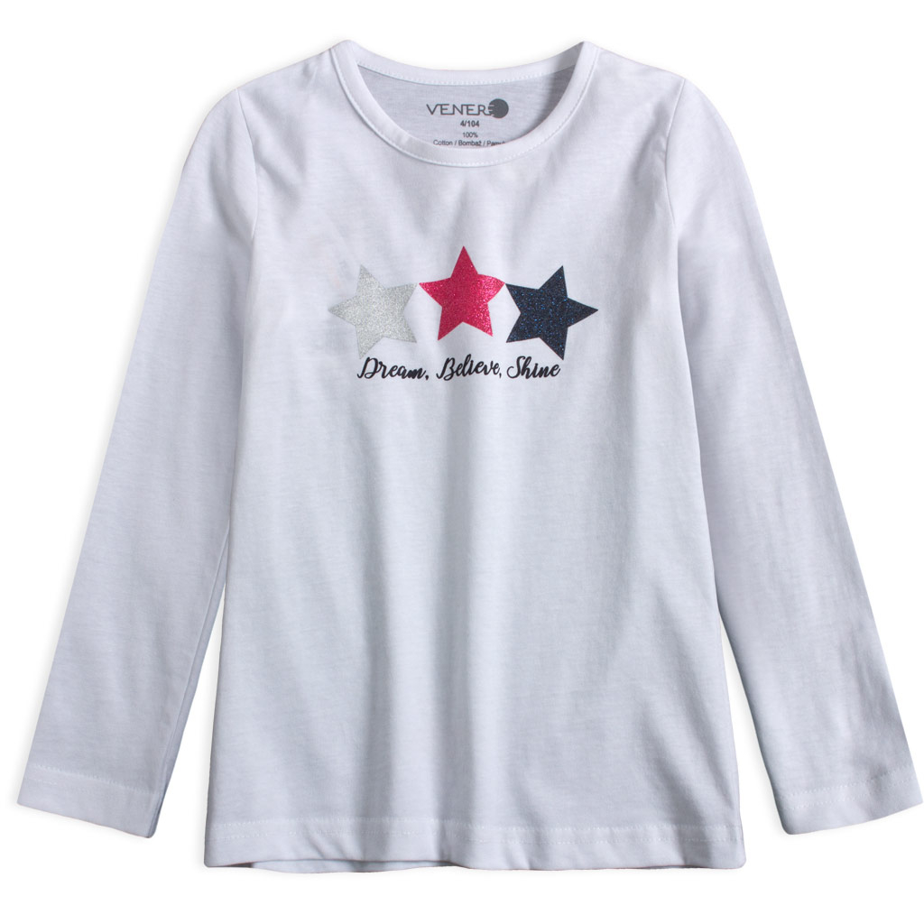Dievčenské tričko s dlhým rukávom. Pružný bavlnený úplet s potlačou.