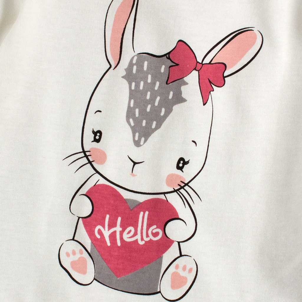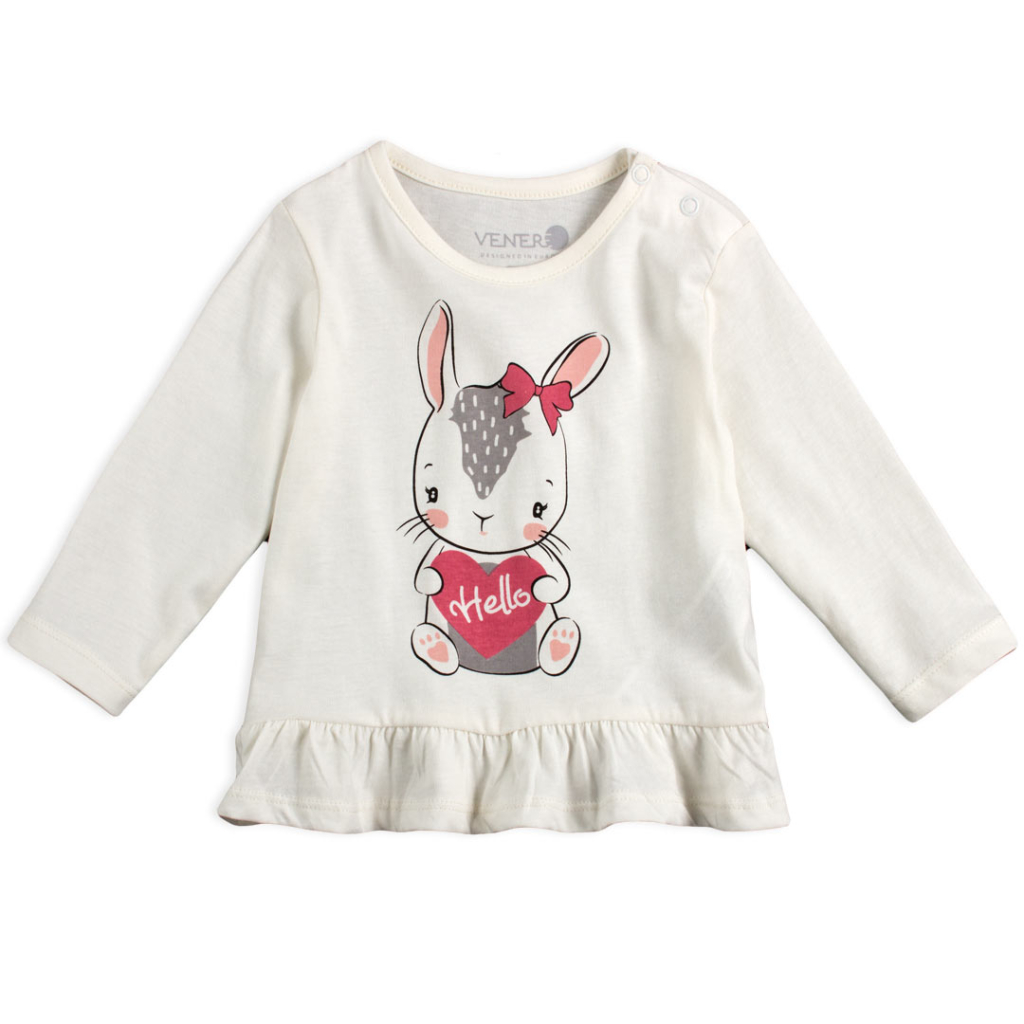 Dievčenské tričko s dlhým rukávom. Utešená potlač zajačika. Na ramene zapínanie na patenty. Príjemný bavlnený úplet.Dodatočné parametre