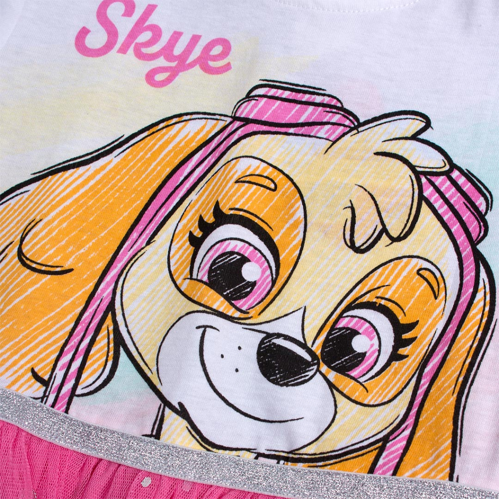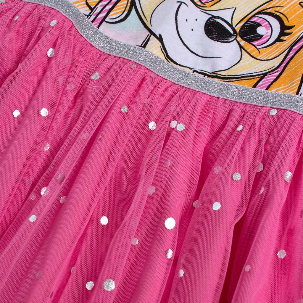 Dievčenské šaty so Skye z Labkovej patroly. Vrchná časť s obrázkom, krátky rukáv. Sukňa z nazberaného ružového tylu so striebornými bodkami. Spodnička z pružného bavlneného úpletu. V páse gumička so striebornou nitkou.Dodatočné parametre