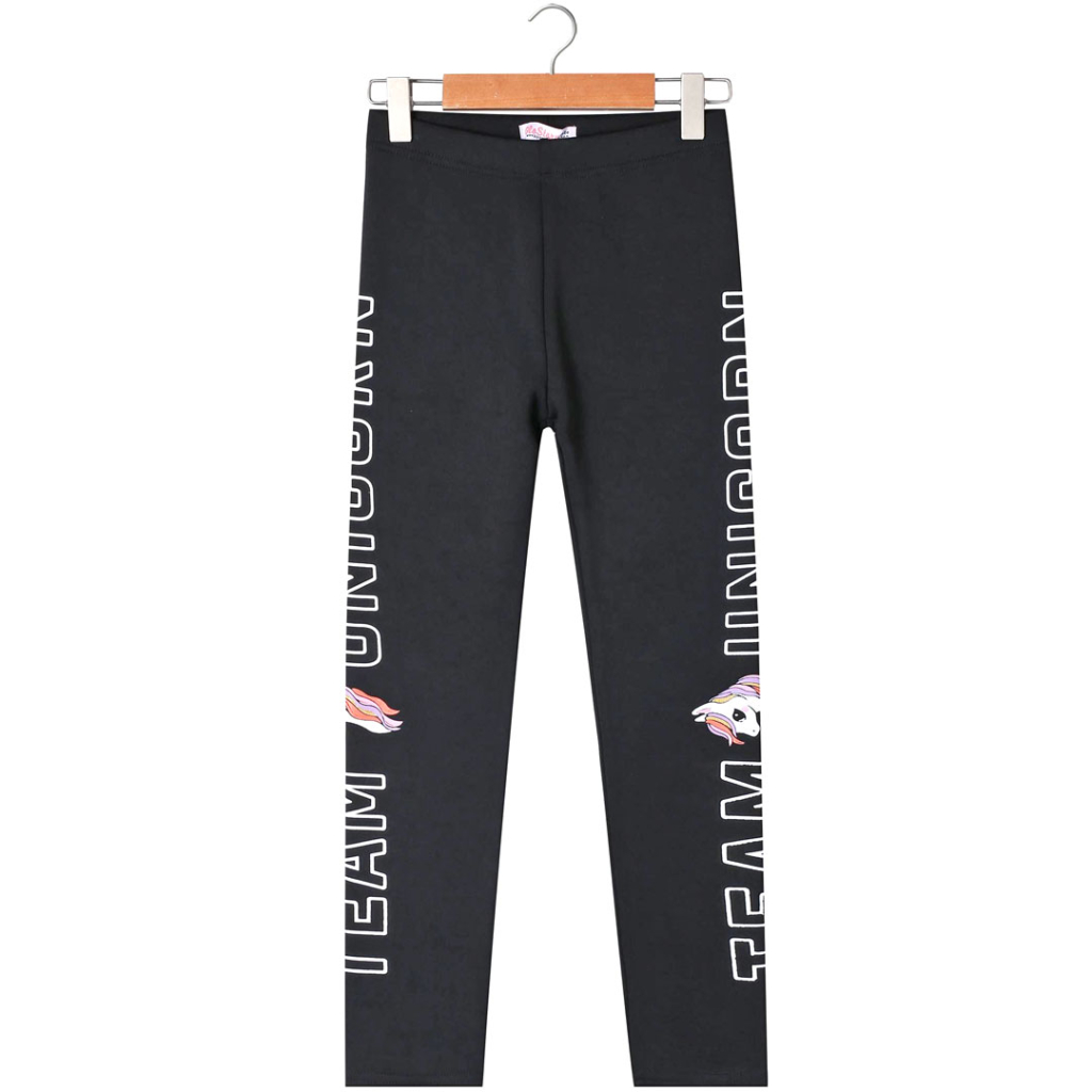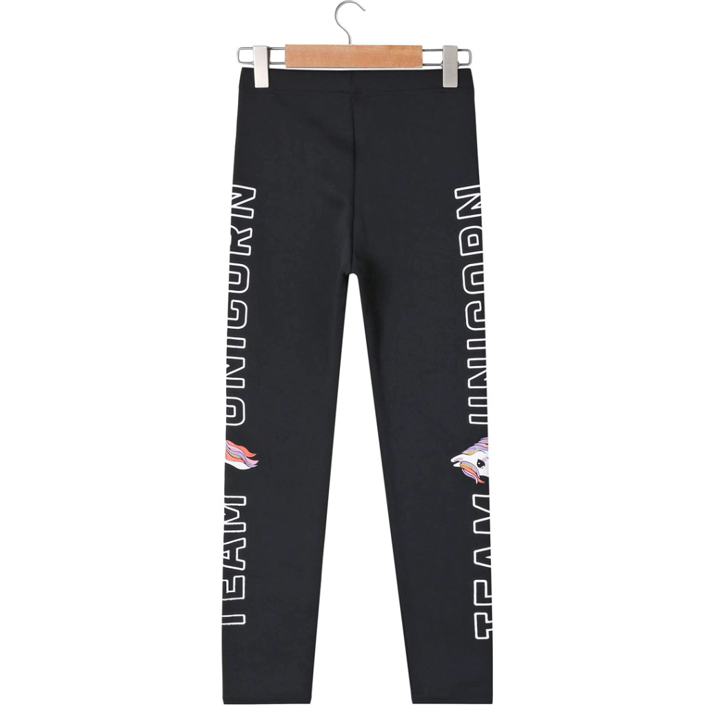 Dievčenské zateplené legíny s nápisom a jednorožcom. Pružný úplet s jemným chĺpkom na rubovej strane.