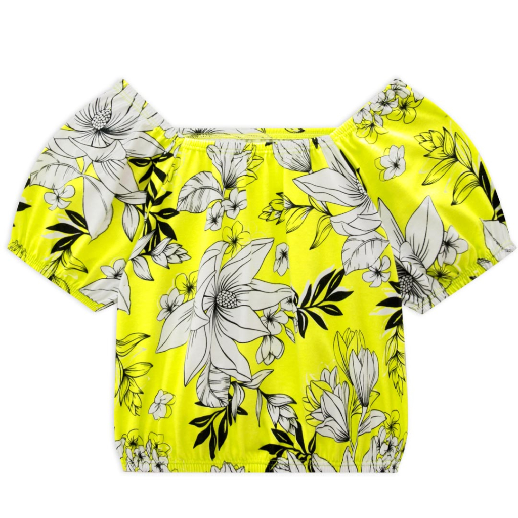 Crop top s krátkym rukávom, okraje do gumičiek. Potlač kvetov. Príjemný, pružný úplet. Vyrobené v Brazílii.Dodatočné parametre