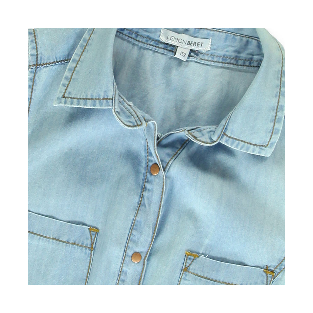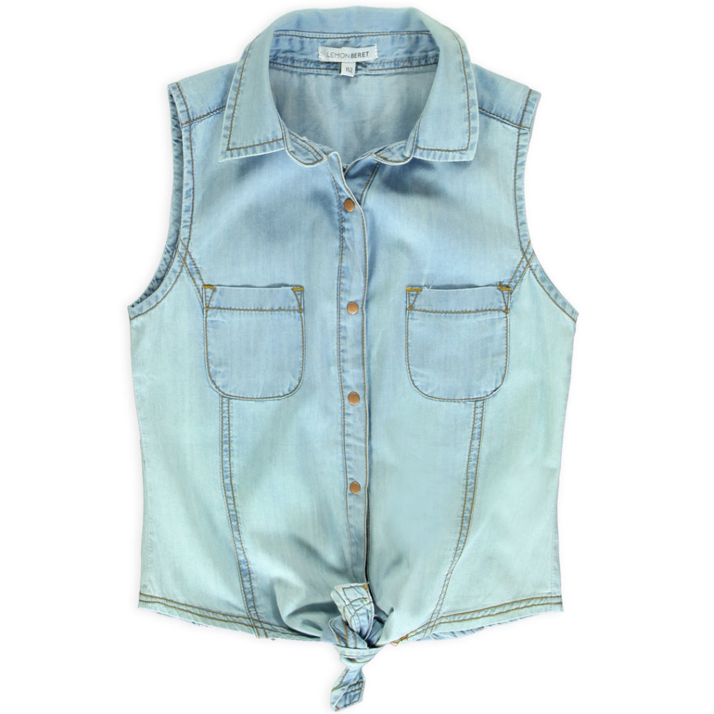 Dievčenský košeľový top bez rukávov. Zapínanie na patentky, dole uzol. Našité vrecká. Príjemná, odľahčená džínsovina.Dodatočné parametre