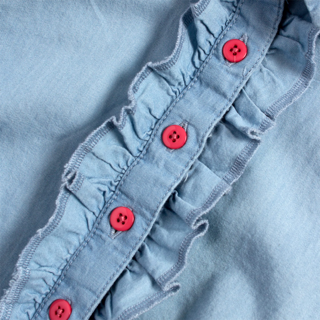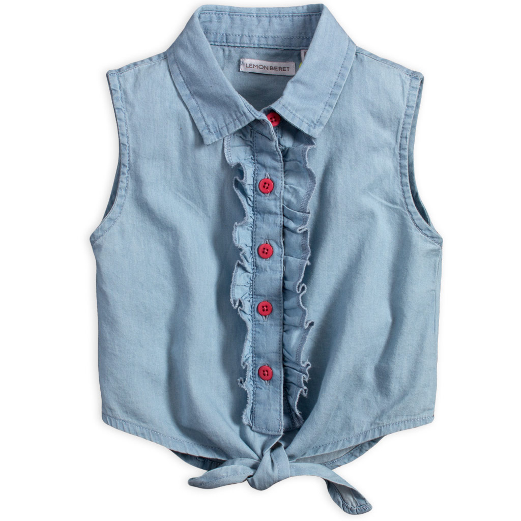 Dievčenský košeľový top bez rukávov. Zapínanie na farebné gombíky, dole uzol. Príjemná, odľahčená džínsovina.Dodatočné parametre