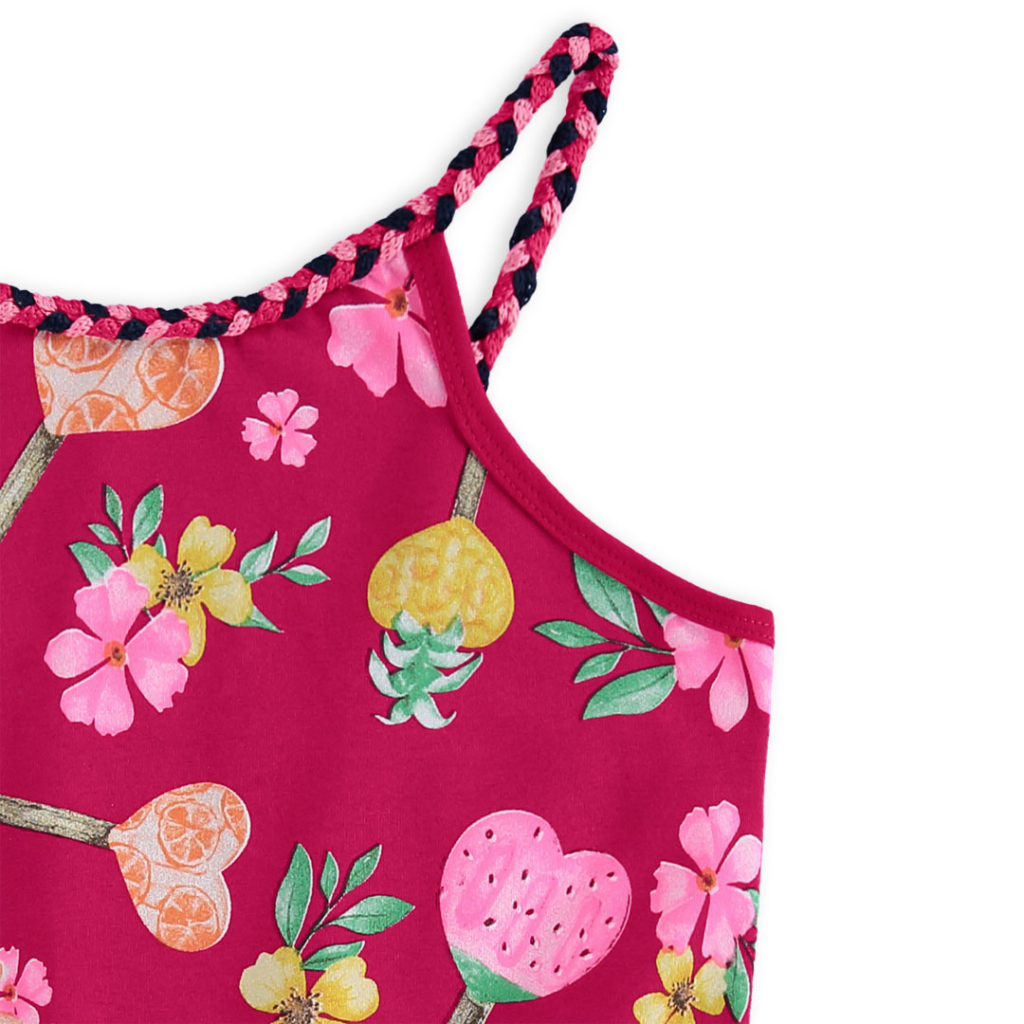 Nepostrádateľný kúsok v letnom šatníku - ľahký overal bez rukávov. V páse gumička, ozdobná mašlička. Bavlnený úplet s farebnou potlačou. Vyrobené v Brazílii.Dodatočné parametre