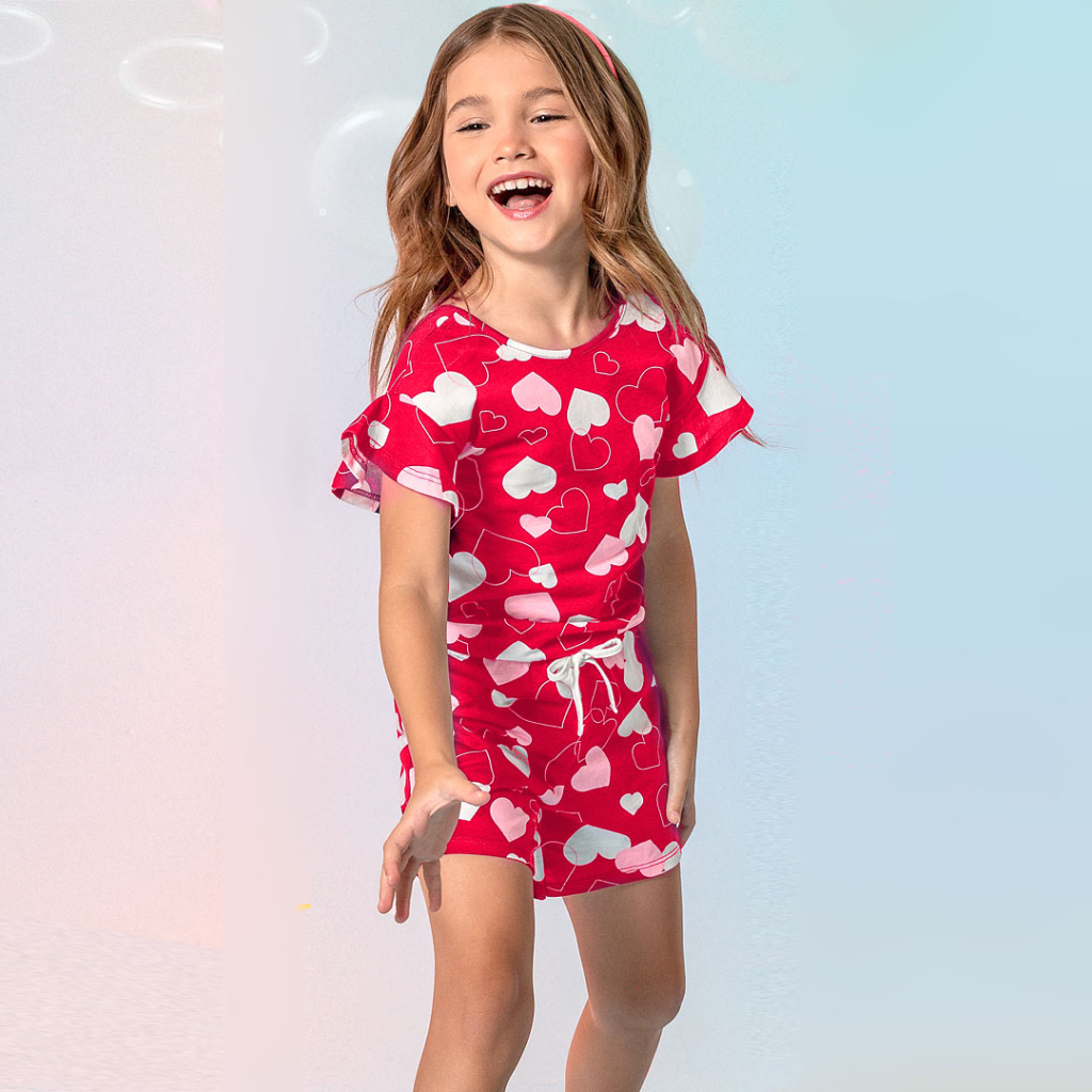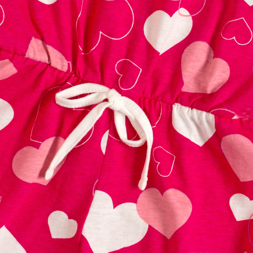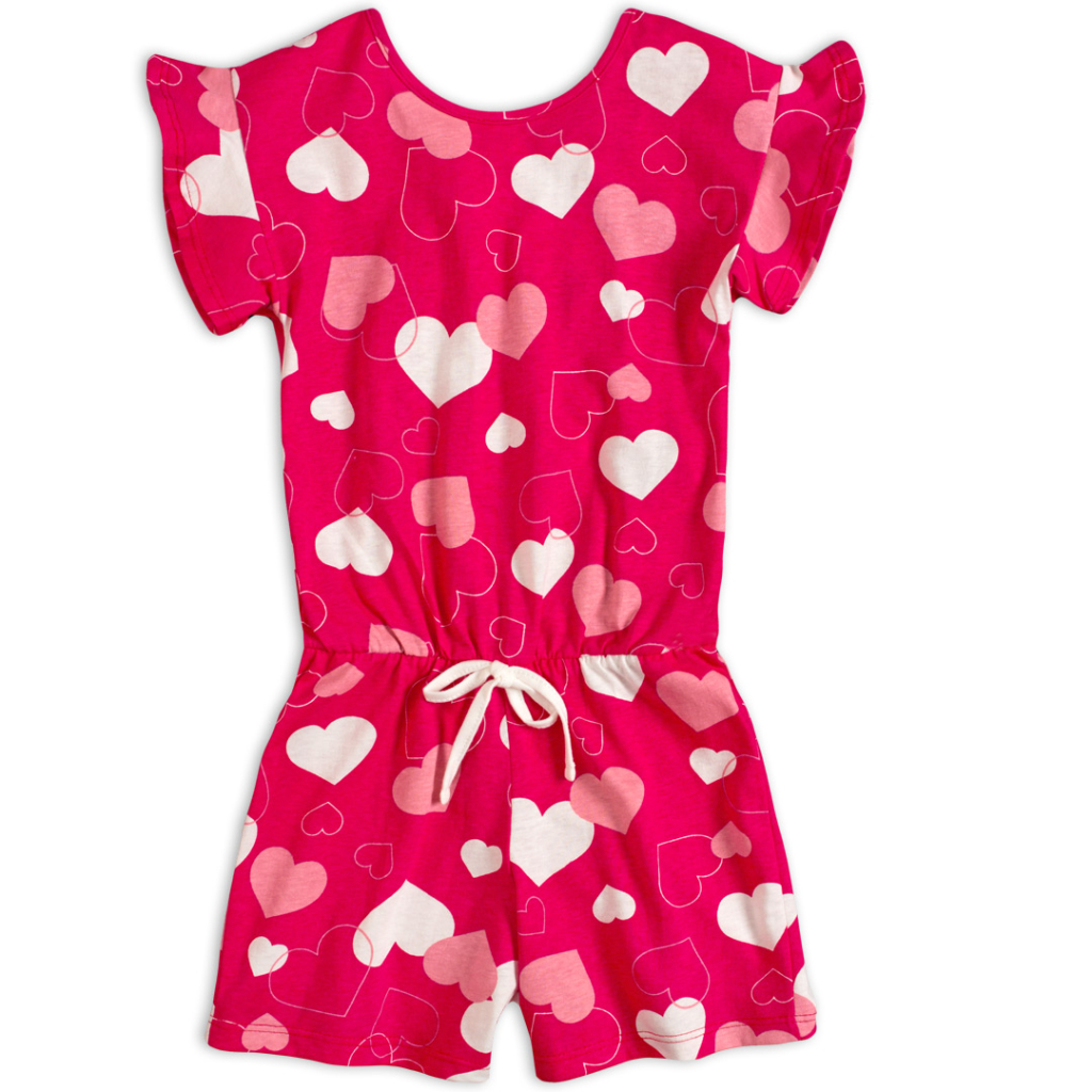 Skvelý kúsok do letných dní - pohodlný overal s krátkym rukávom. V páse gumička, našitá mašlička. Príjemný bavlnený úplet s krásnou potlačou srdiečok. Vyrobené v Brazílii.Dodatočné parametre