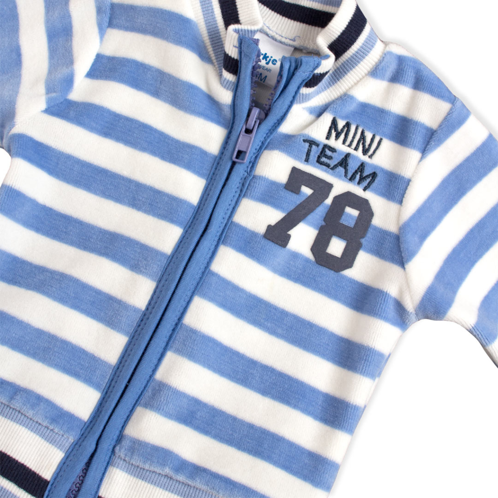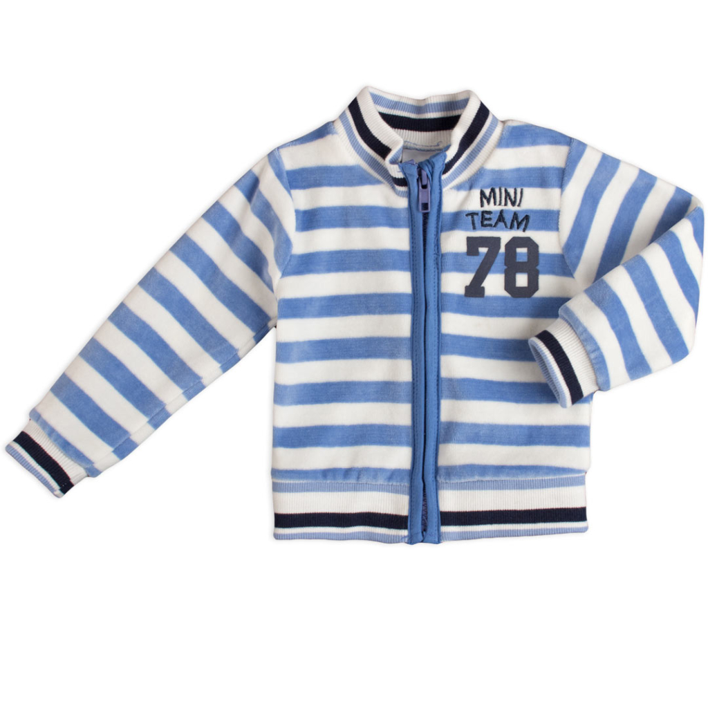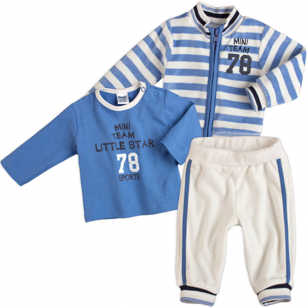 3-dielna dojčenská súprava. Mikina na zips, bez kapucne, pohodlné tepláčiky s úzkym lampasom. Z príjemného, jemného zamatu. Tričko s dlhým rukávom, s potlačou, zapínanie na ramene. Pružný úplet.Dodatočné parametre