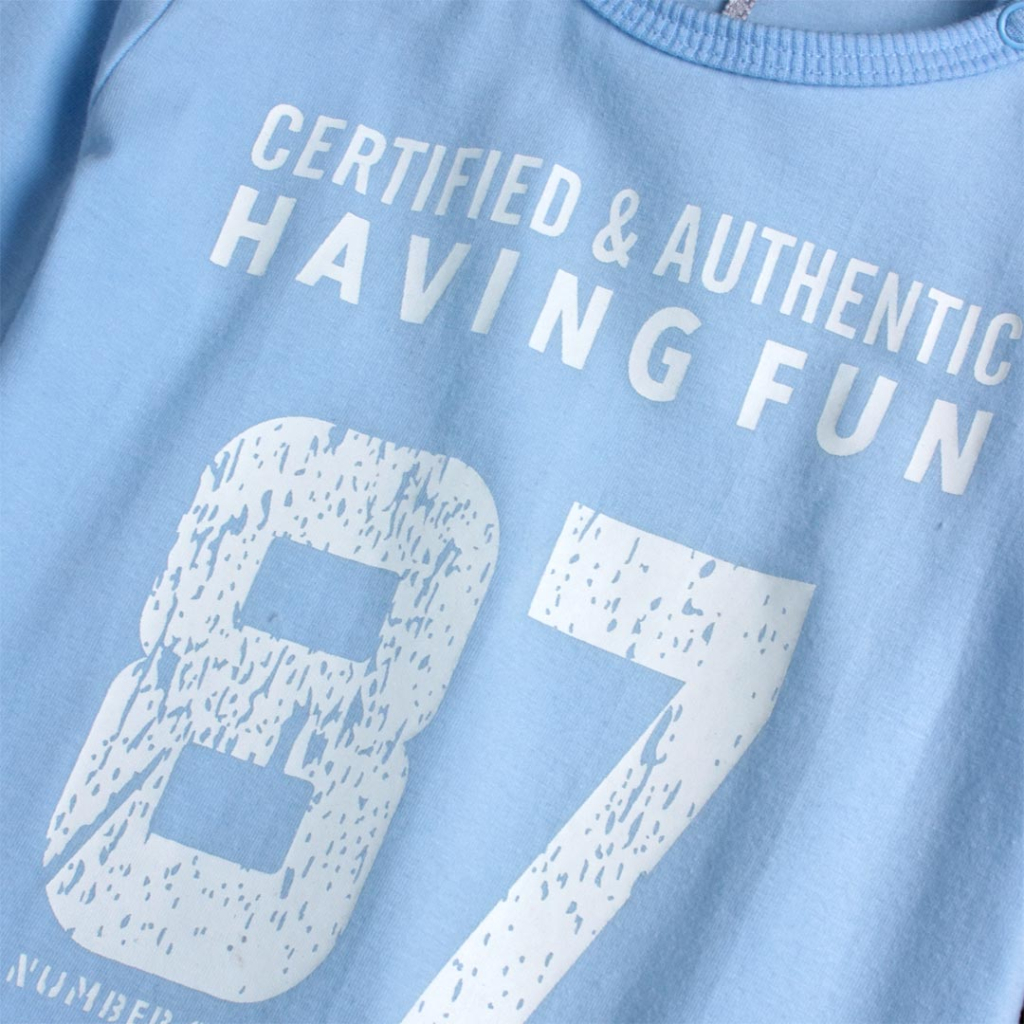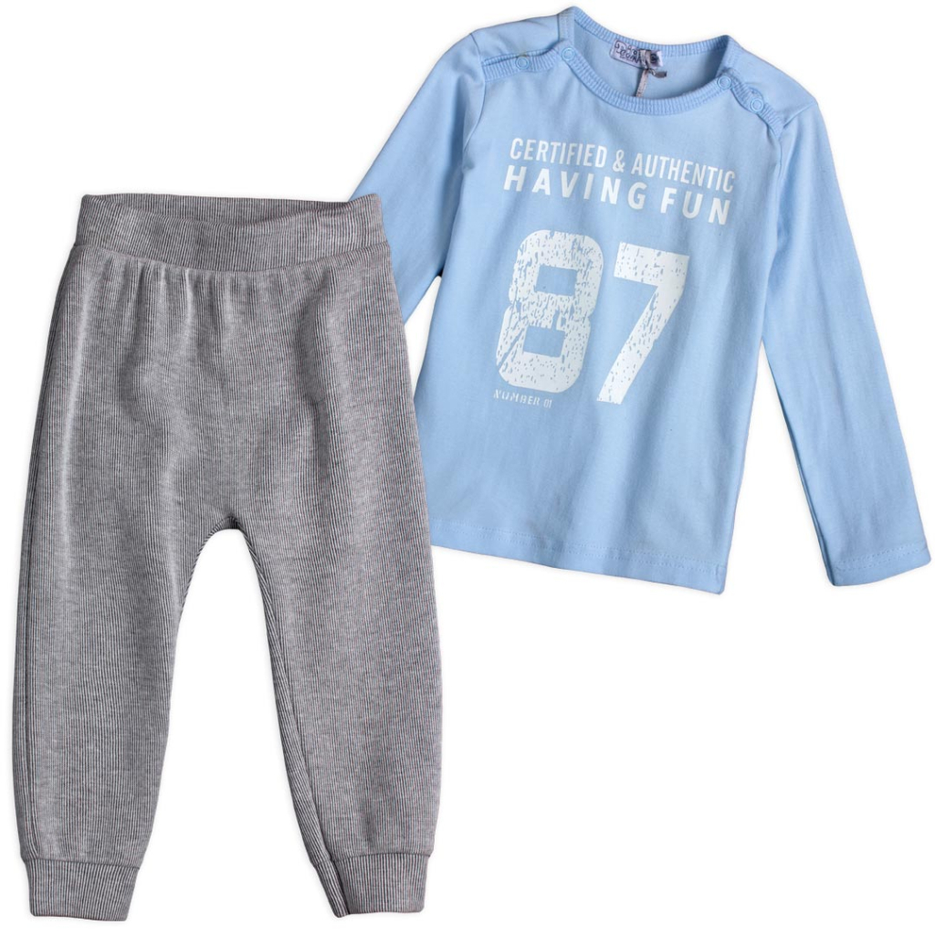 Dojčenská súprava - tričko s dlhým rukávom, s potlačou. Na ramenách zapínanie na patentky. Pohodlné tepláčiky bez potlače, v páse guma. Príjemný, mäkký a pružný materiál.Dodatočné parametre
