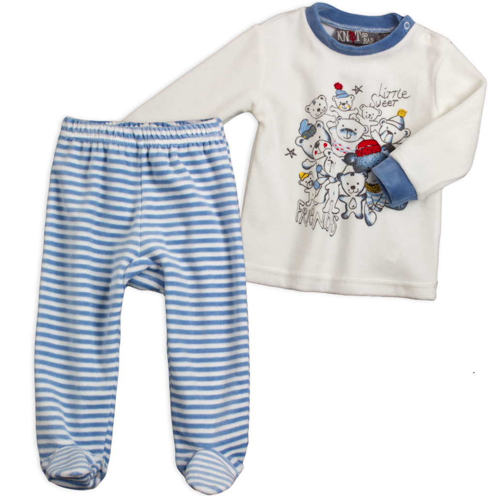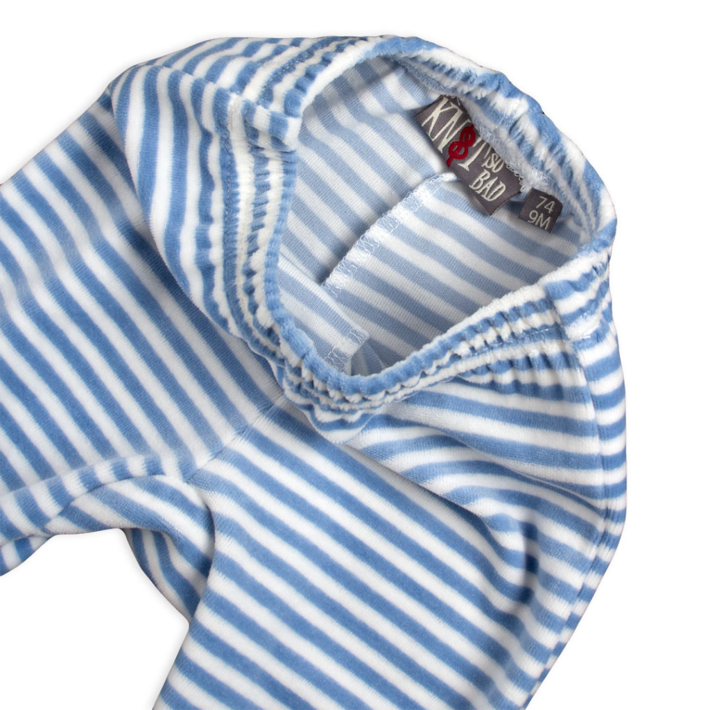 Dojčenská súprava z hebkého zamatu. Tričko - je možné využiť aj ako mikinu - má zapínanie na patentky na ramene, pre ľahšie obliekanie. Pruhované nohavice - polodupačky.Dodatočné parametre