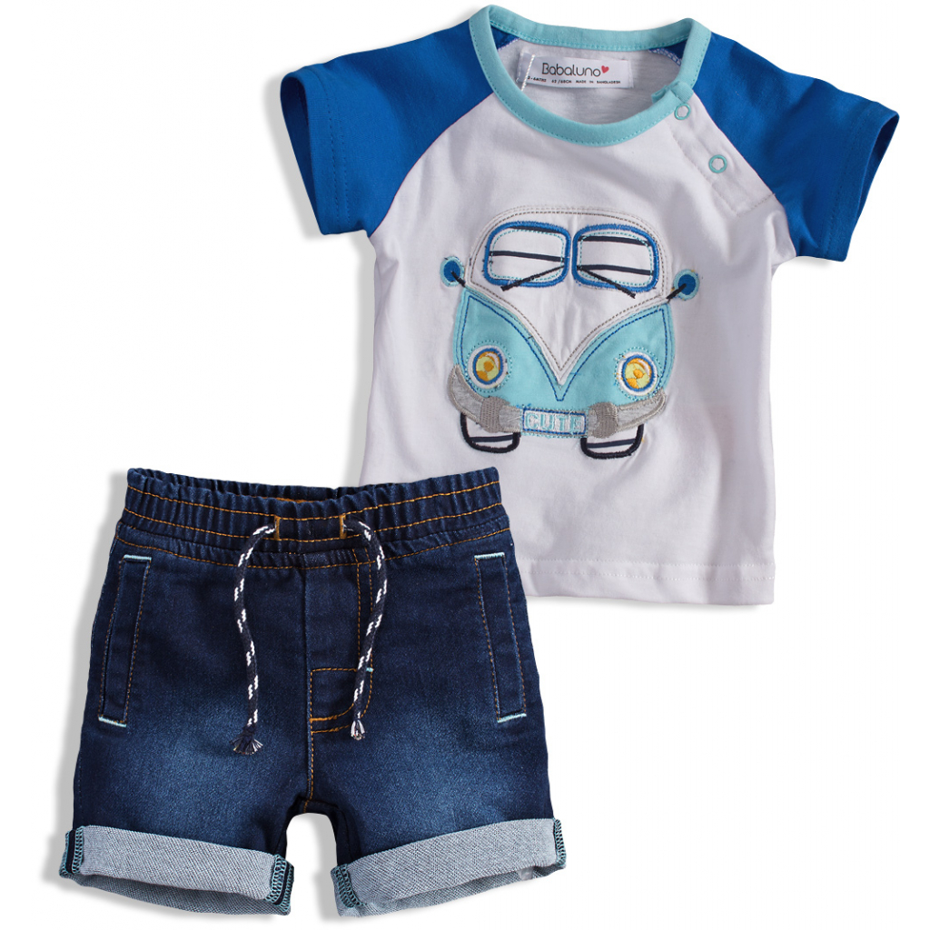 Tričko s krátkym rukávom, s našitou aplikáciou. Zapínanie vpredu na boku na patentky. Džínsové šortky v páse na gumu. Šnúrka ozdobná. Falošné vrecká. Vyhrnutie nohavíc nie je prišité. Pružná džínsovina.Dodatočné parametre