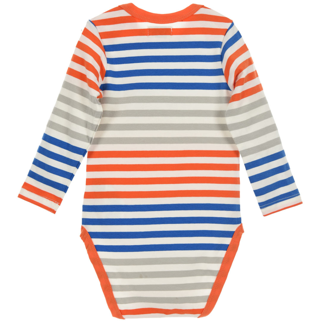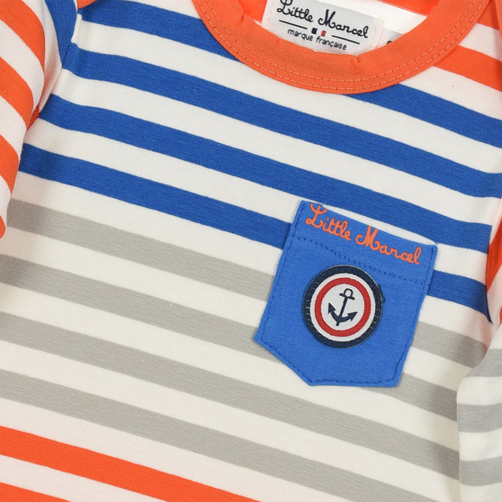 Pruhované body s dlhým rukávom, s našitým vreckom. Zapínanie na patentky medzi nožičkami. Mäkký a pohodlný materiál. Francúzska značka Little Marcel.