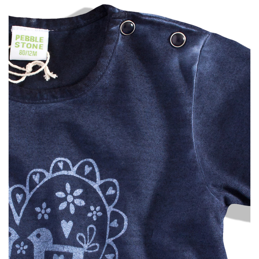 Dojčenské tričko pre dievčatká. Krátky rukáv, na ramene zapínanie na ozdobné patentky. Vpredu potlač. Holandská značka PEBBLESTONE.Dodatočné parametre