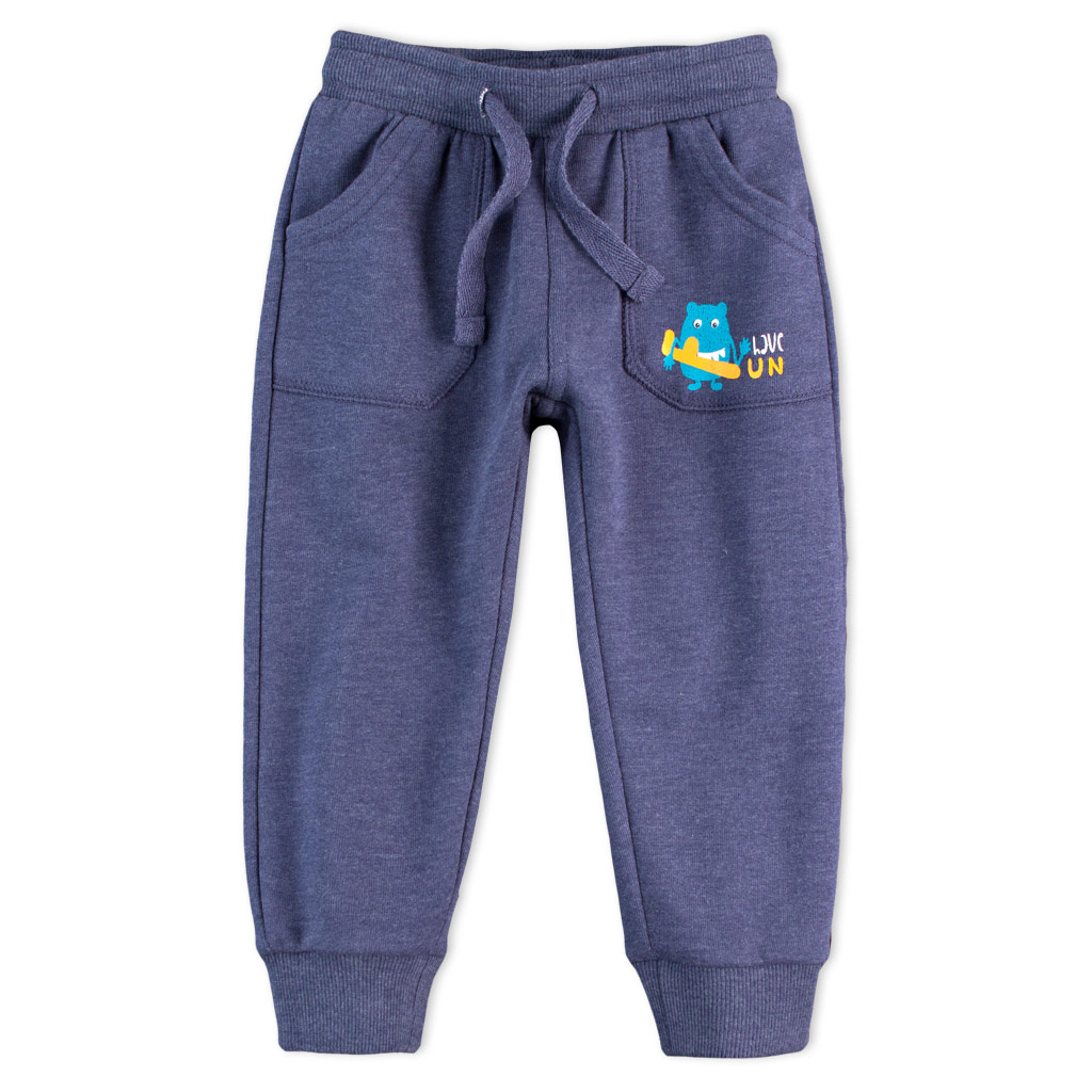 Dojčenské tepláčiky s vreckami a potlačou vpredu. V páse guma a šnúrka na stiahnutie. Kvalitná teplákovina na rube bez chĺpku.Dodatočné parametre