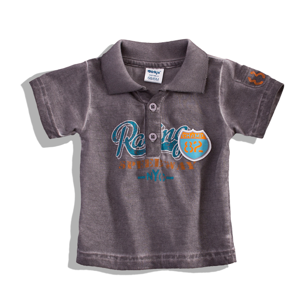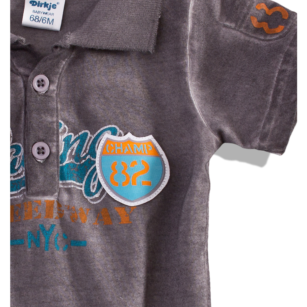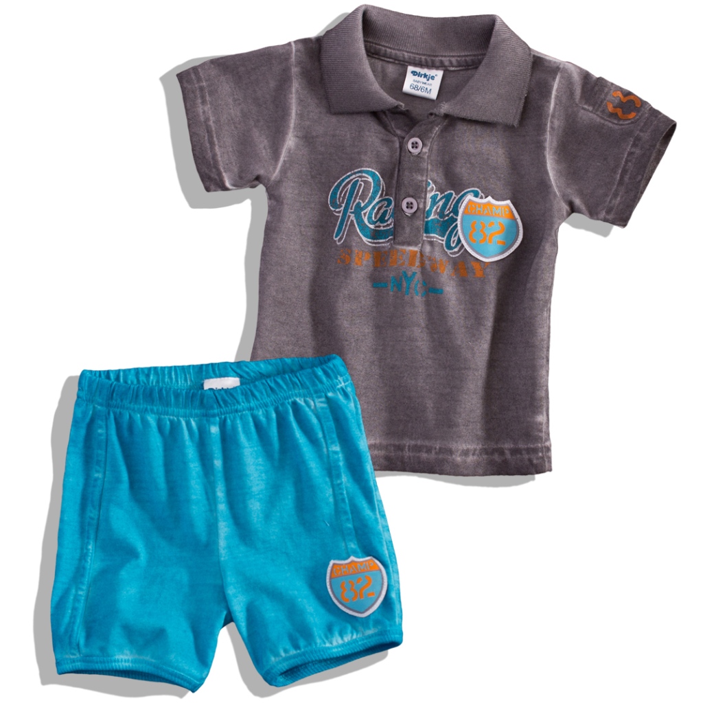 Dojčenský komplet DIRKJE - tričko s golierikom, zapínanie na gombíčky. S potlačou a nášivkami. Krátke nohavice do gumy.Dodatočné parametre