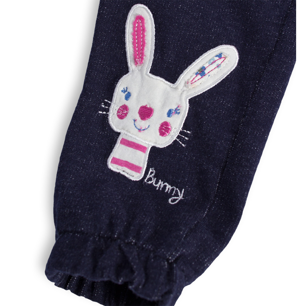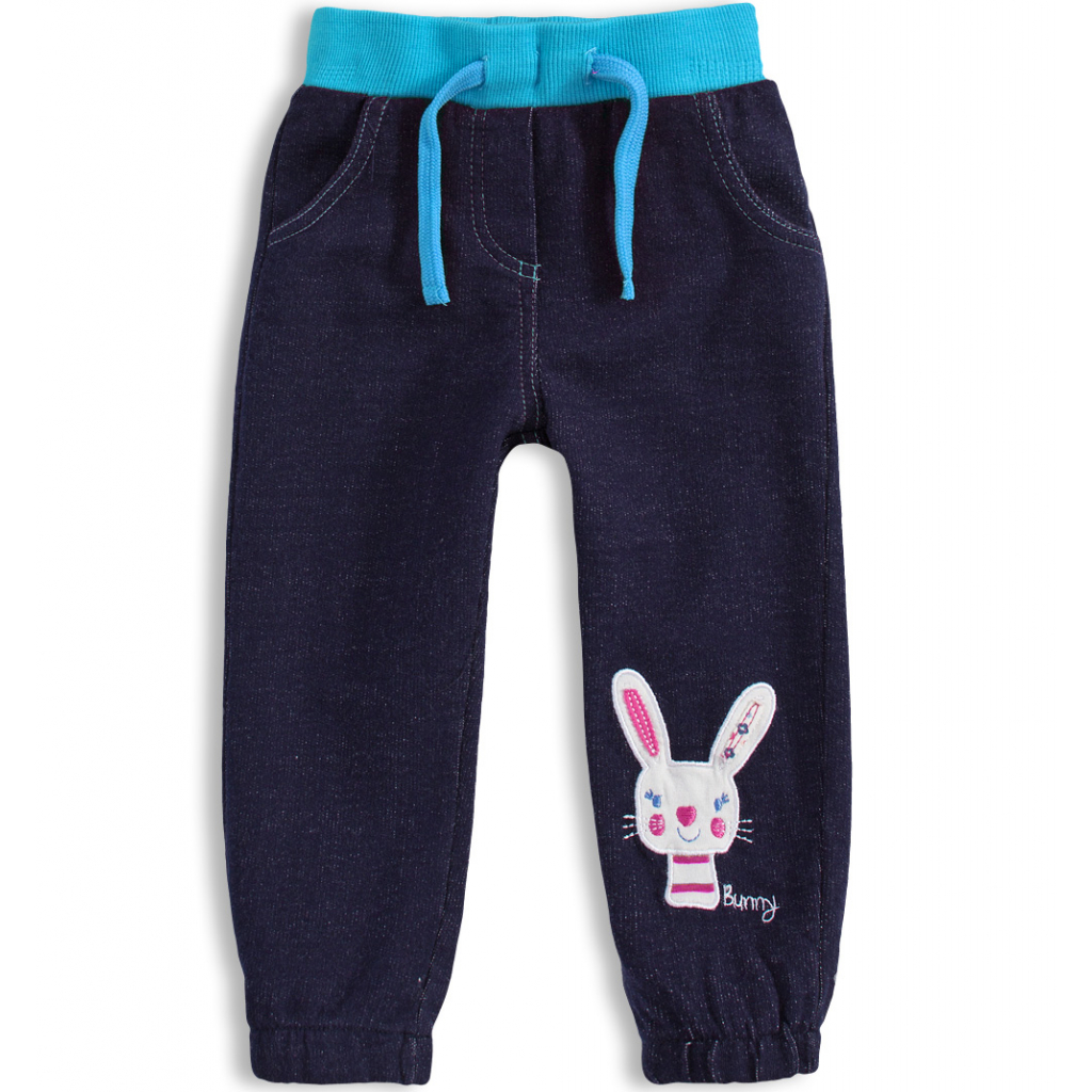 Detské nohavice z bavlneného úpletu džínsového vzhľadu. Na nohavici našitý zajačik. V páse guma, šnúrka iba ozdobná. Vpredu vrecká.Dodatočné parametre